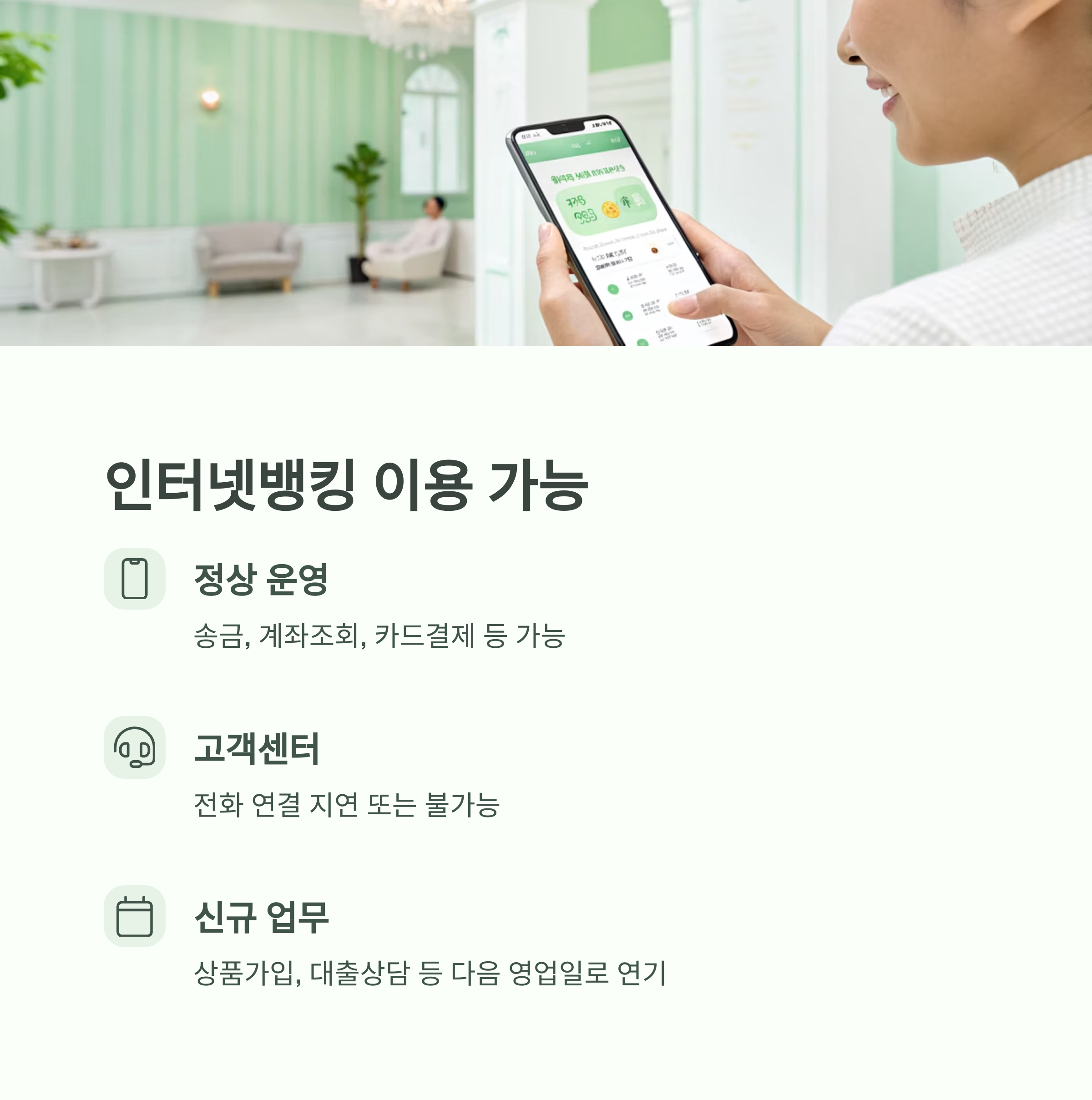 일부 상품 신규가입, 대출상담 등은 다음 영업일로 미뤄질 수 있습니다.