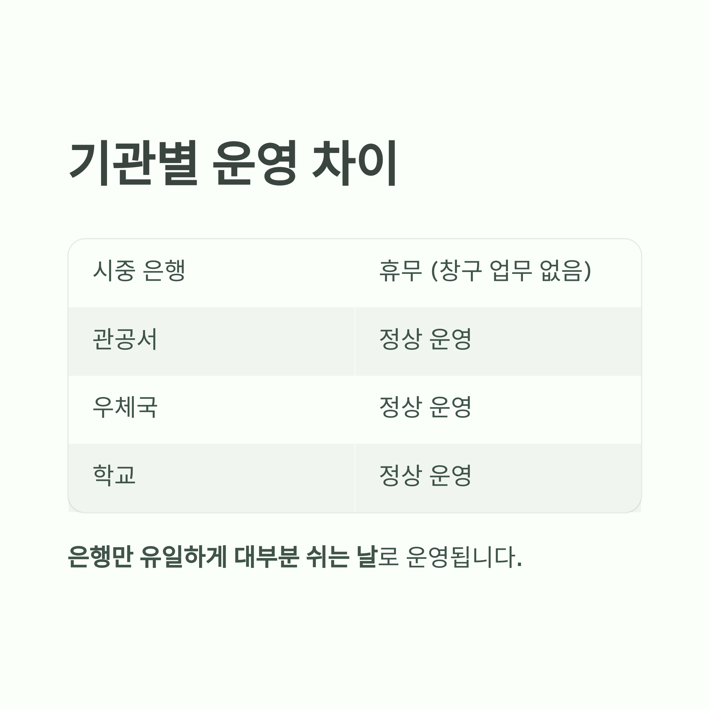 | 시중 은행 | X (휴무) | 창구 업무 없음 |
