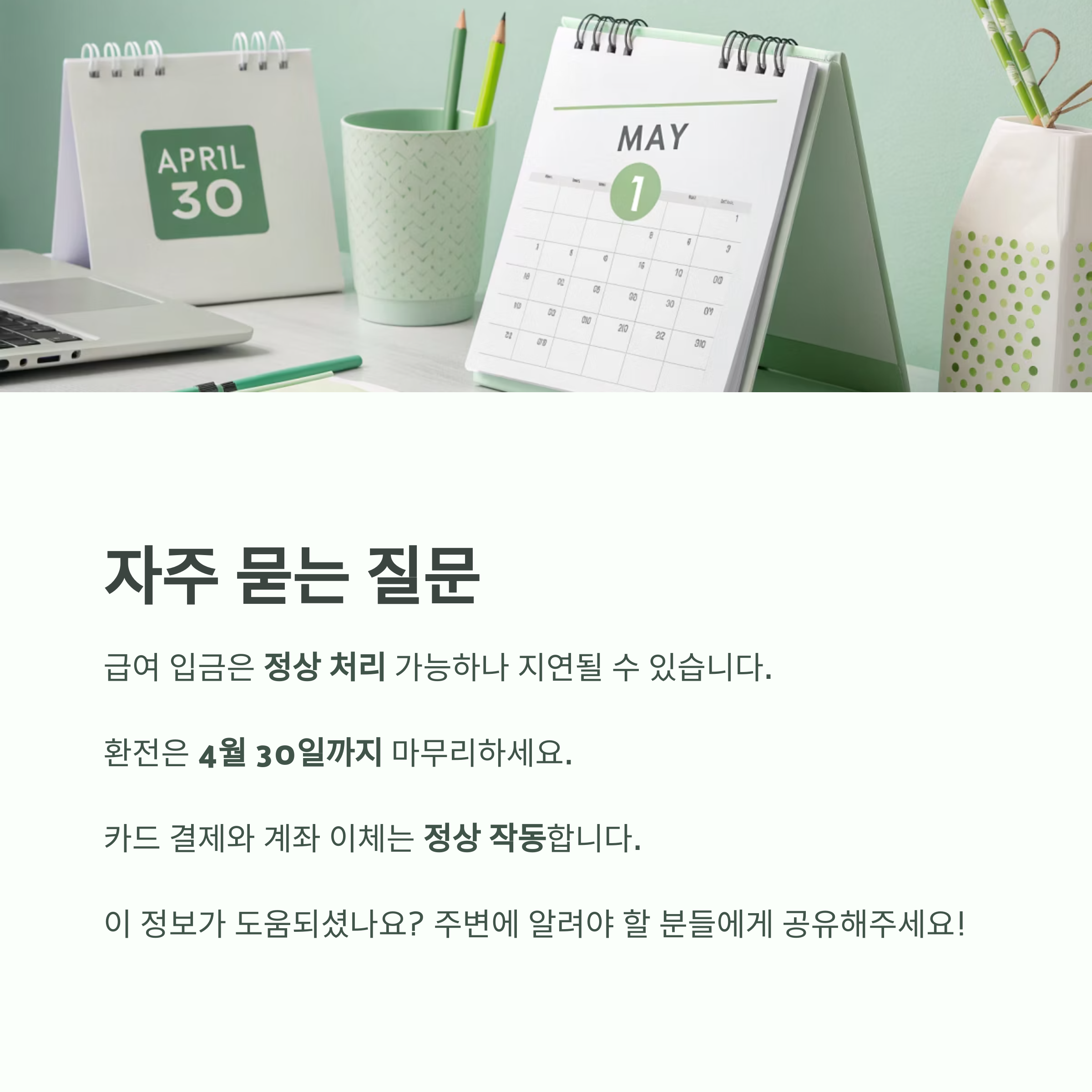 Q. 은행에서 보내는 급여, 5월 1일에도 들어오나요?