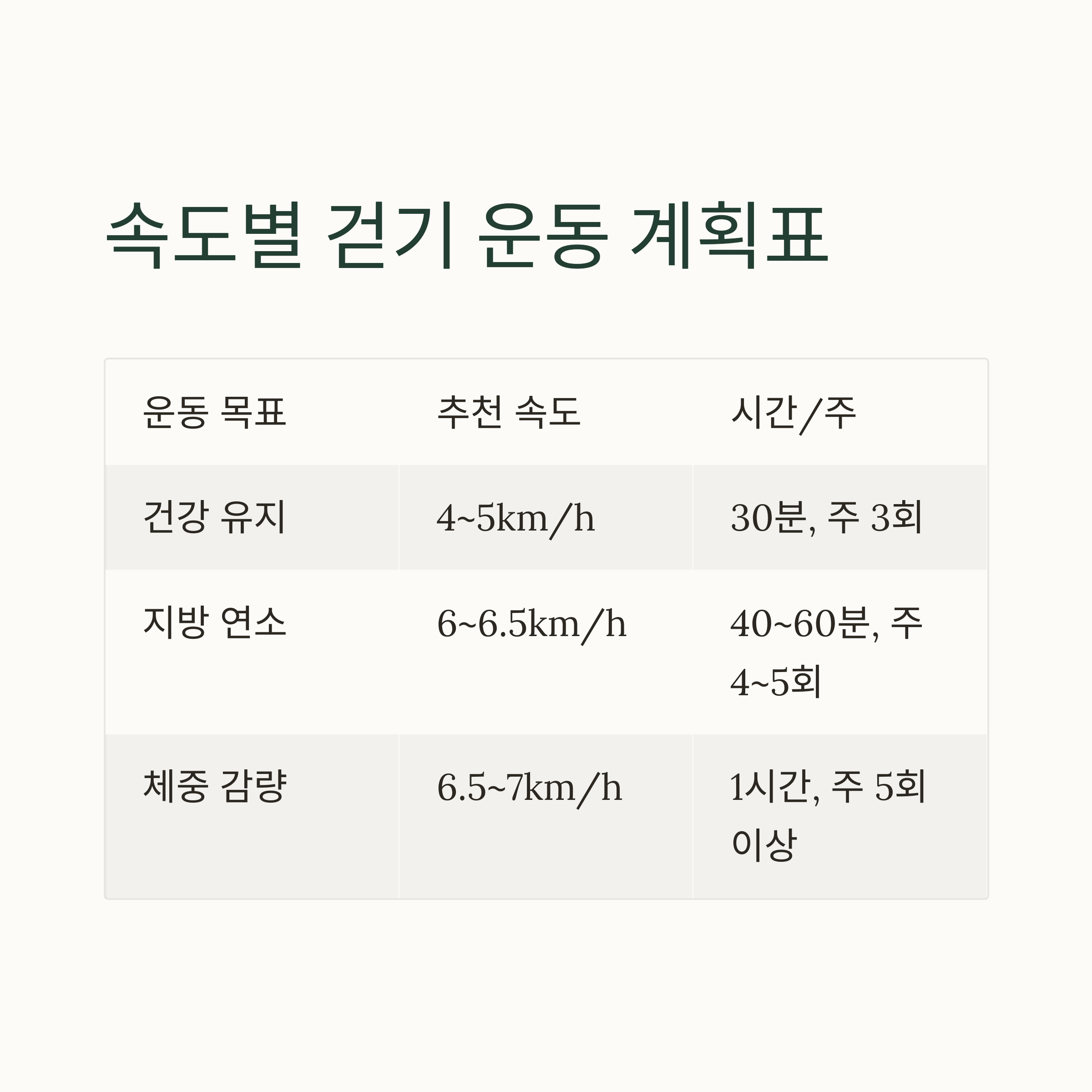 | 건강 유지 | 4~5km/h | 30분, 주 3회 |