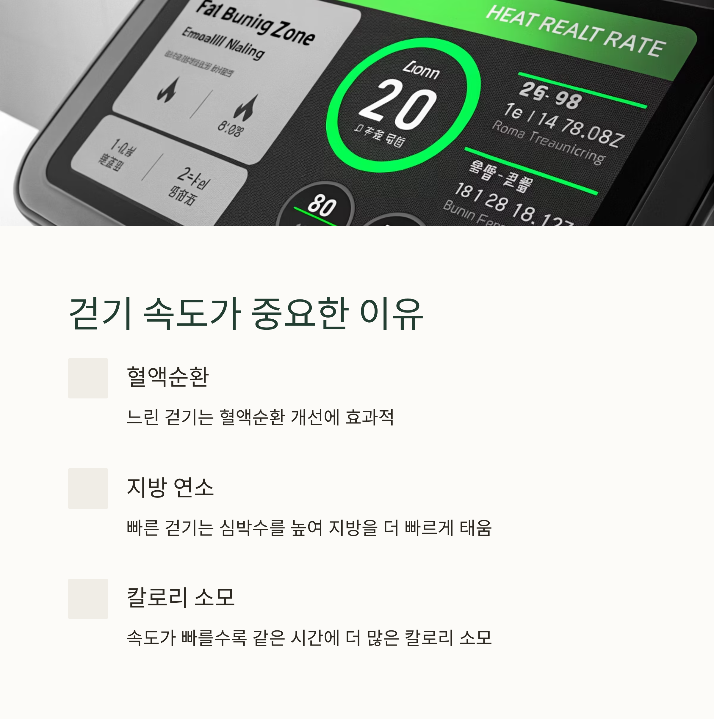 또 한 가지! 속도는 심박수에 직접적인 영향을 주기 때문에 지방 연소 구간에 진입하기 위한 핵심 열쇠이기도 합니다. 즉, 걷기 효과를 ‘진짜’로 보려면 속도를 무시할 수 없다는 이야기죠.