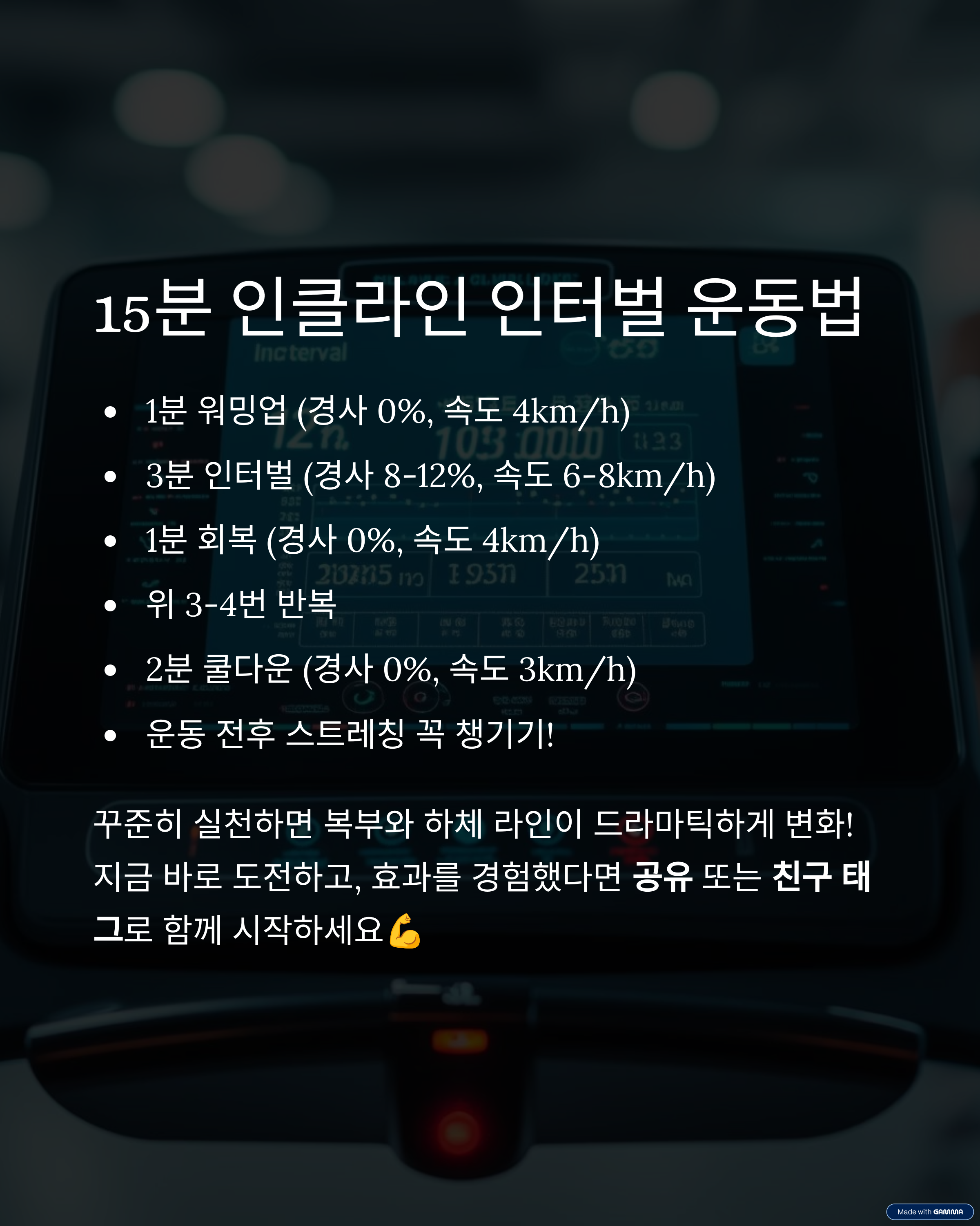 인클라인 인터벌 트레이닝은 운동 초보자도 진입장벽 없이 시작할 수 있는 다이어트 전략입니다. 짧은 시간 투자로 복부 지방, 하체 라인, 체지방률을 동시에 관리하고 싶다면 이 방법을 적극 활용해보세요.