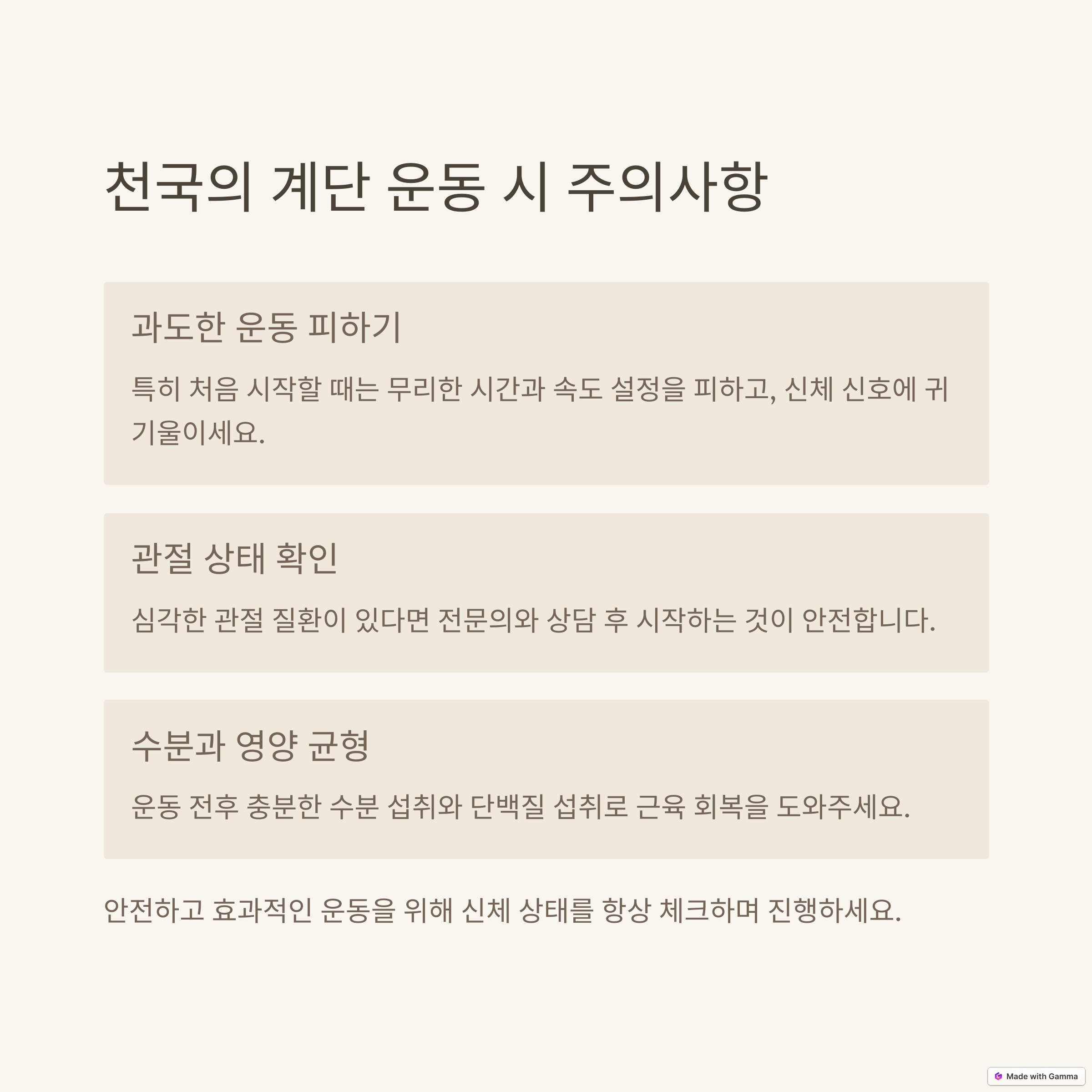 실제로 많은 직장인들이 점심시간이나 퇴근 후 짧은 시간을 활용해 천국의 계단 운동을 실천하고 있습니다. 이 운동의 가장 큰 장점은 실내에서 안전하게 수행할 수 있 다는 점입니다. 비 오는 날이나 미세먼지가 심한 날에도 계단만 있다면 언제든지 운동할 수 있어요. 특히 계단을 내려올 때는 무릎 충격을 최소화하기 위해 다리의 근력을 활용해 천천히 내려오는 것이 좋습니다. 이러한 방식으로 하루 15분만 실천해도 체중 감량은 물론, 허벅지 및 엉덩이 근육 강화에 큰 도움이 됩니다.