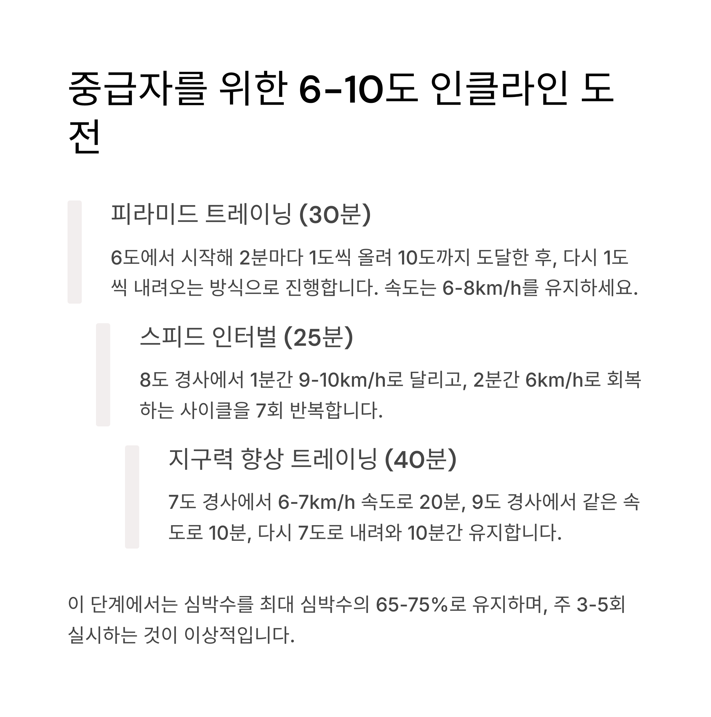 인클라인 6~10도는 땀이 흐르기 시작하는 강도로, 단순 유산소를 넘어 하체 근지구력을 기르고 싶은 분들에게 매우 적합합니다.