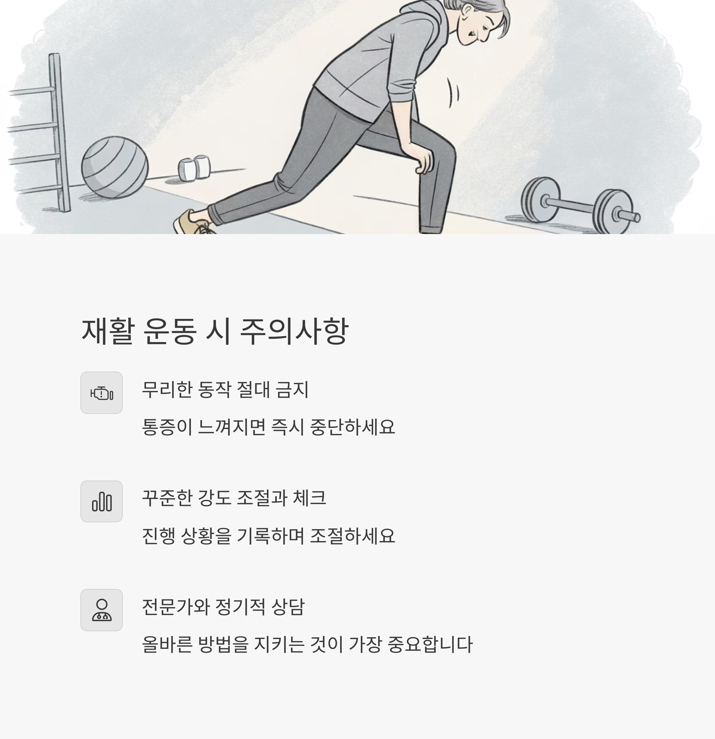 "재활 운동은 순서가 중요합니다. 스트레칭 → 강화 → 유산소 순서로 진행해야 안전합니다."