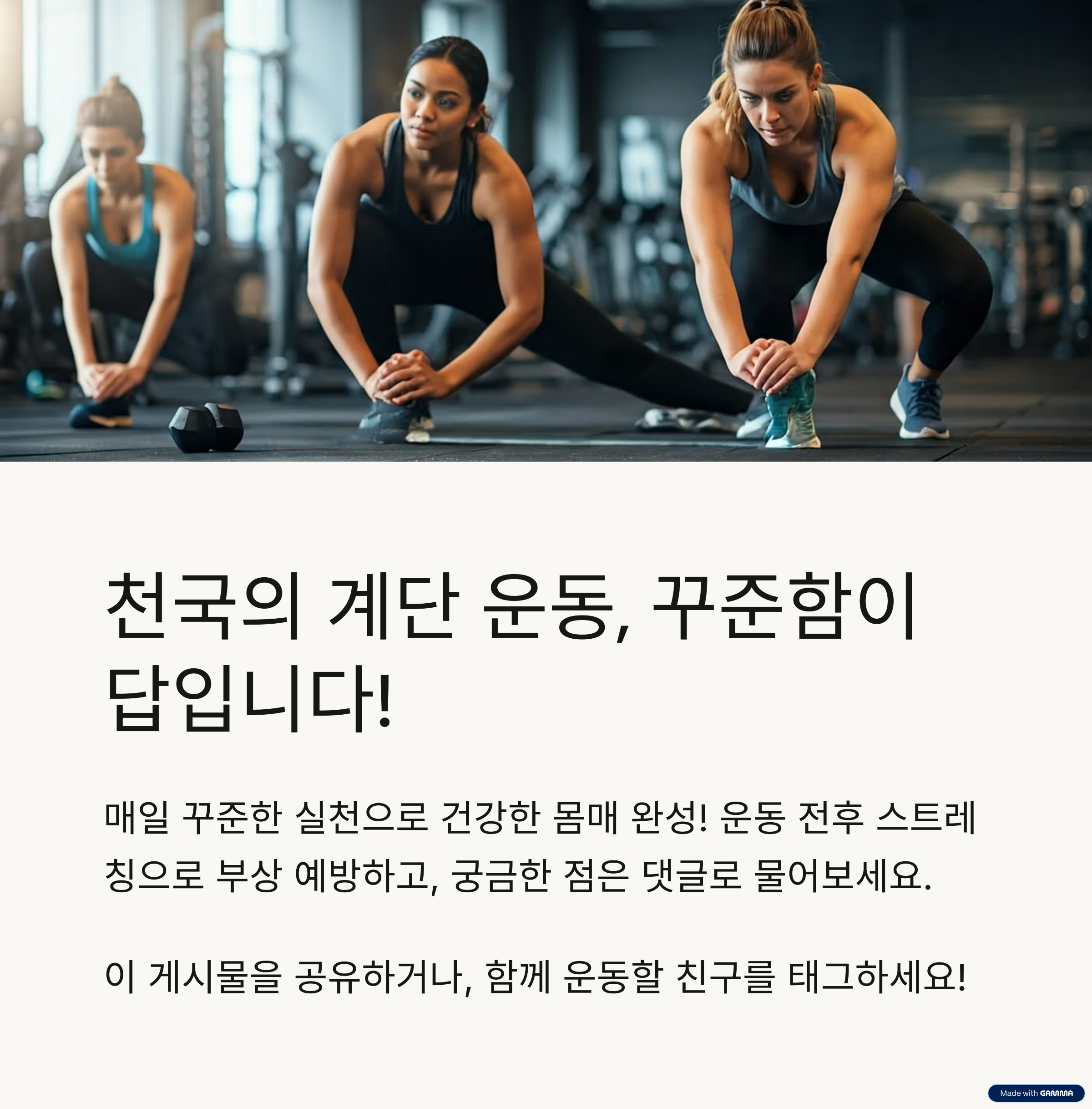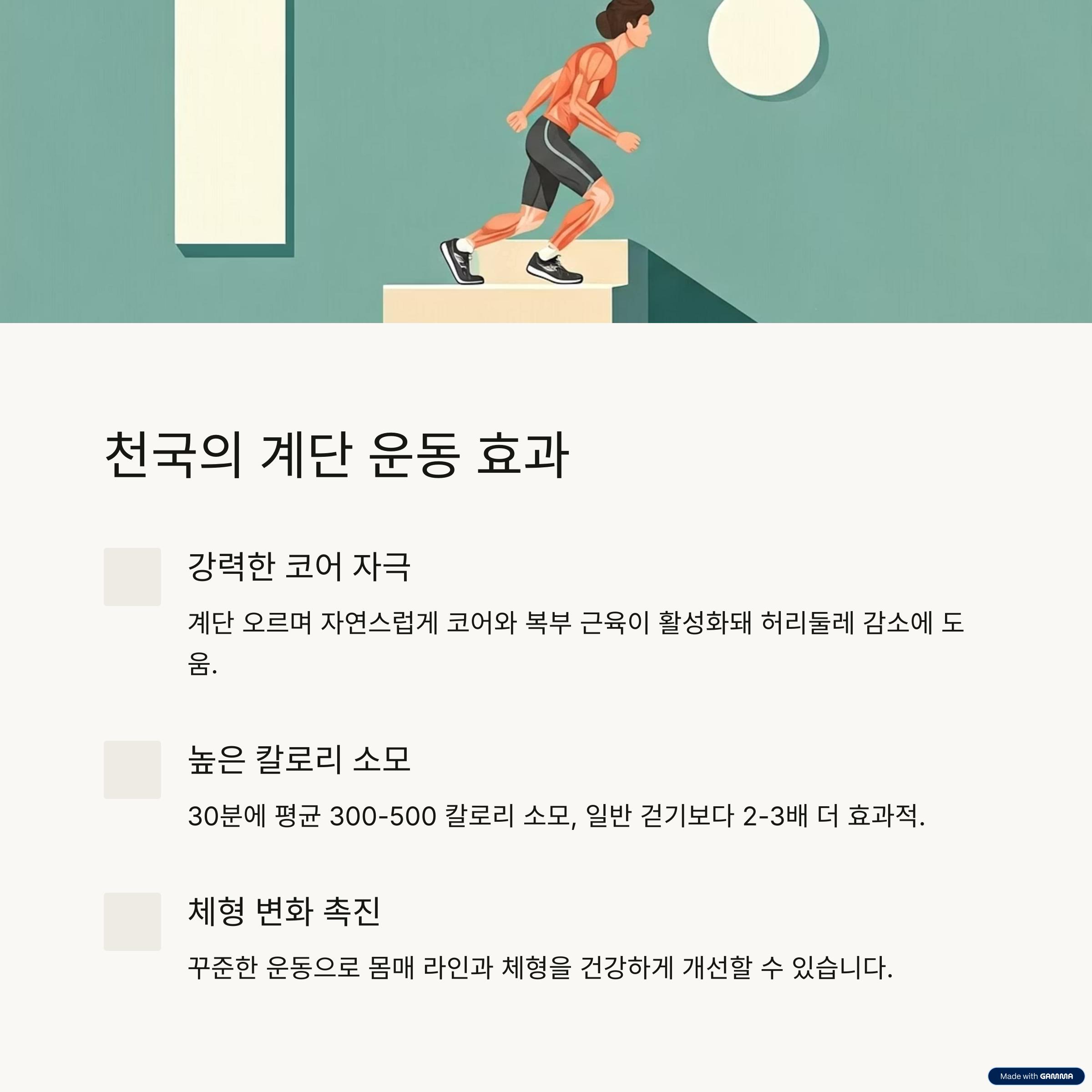 천국의 계단 운동은 장소 제약이 적고, 짧은 시간 내 강한 운동 효과를 볼 수 있어 바쁜 현대인에게 매우 적합합니다. 복부 지방 감소뿐만 아니라 하체 근력 강화, 심폐 지구력 향상, 전신 순환 촉진 등 여러 방면에서 건강 개선에 기여합니다. 꾸준한 루틴 구성과 식단 조절이 병행된다면, 단기간 내 눈에 띄는 복부 슬리밍 효과도 충분히 가능합니다.