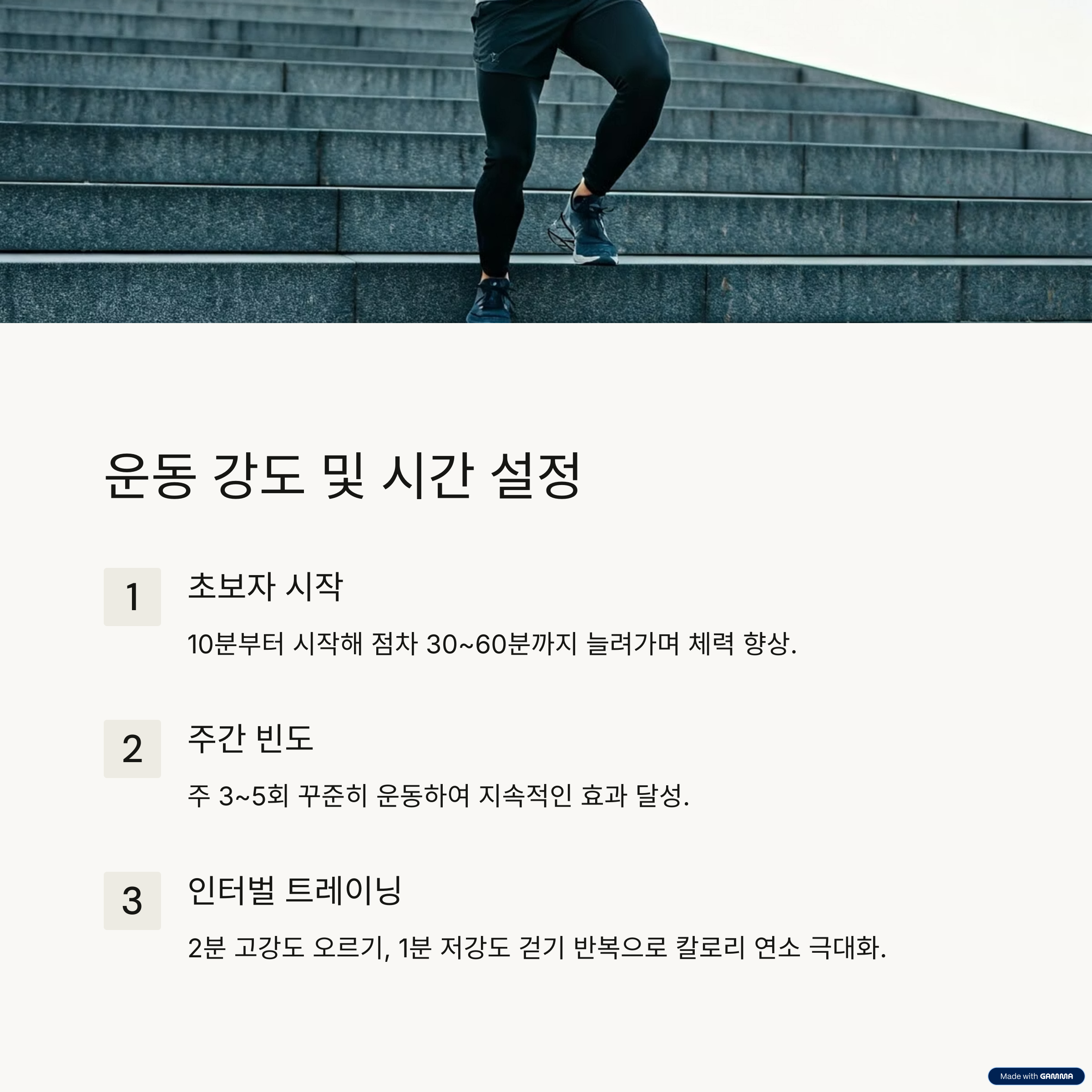 | 짧은 시간 안에 높은 에너지 소비 가능 | 계단을 오르며 자연스럽게 복부에 긴장 유지 | 복부 안정성과 자세 교정에 도움 |