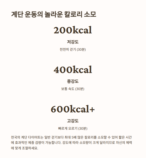 1. 칼로리 소모: 일반 계단 오르기는 10분 동안 약 73kcal를 소모하지만, 천국의 계단은 100kcal 이상 소모합니다.