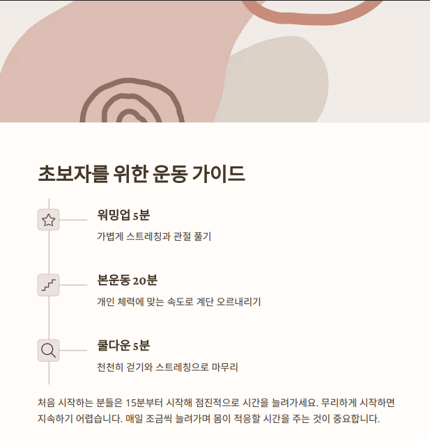 운동 강도 조절: 초보자는 낮은 강도로 10~15분 시작, 숙련자는 인터벌 방식(3분 빠르게, 1분 느리게) 활용.