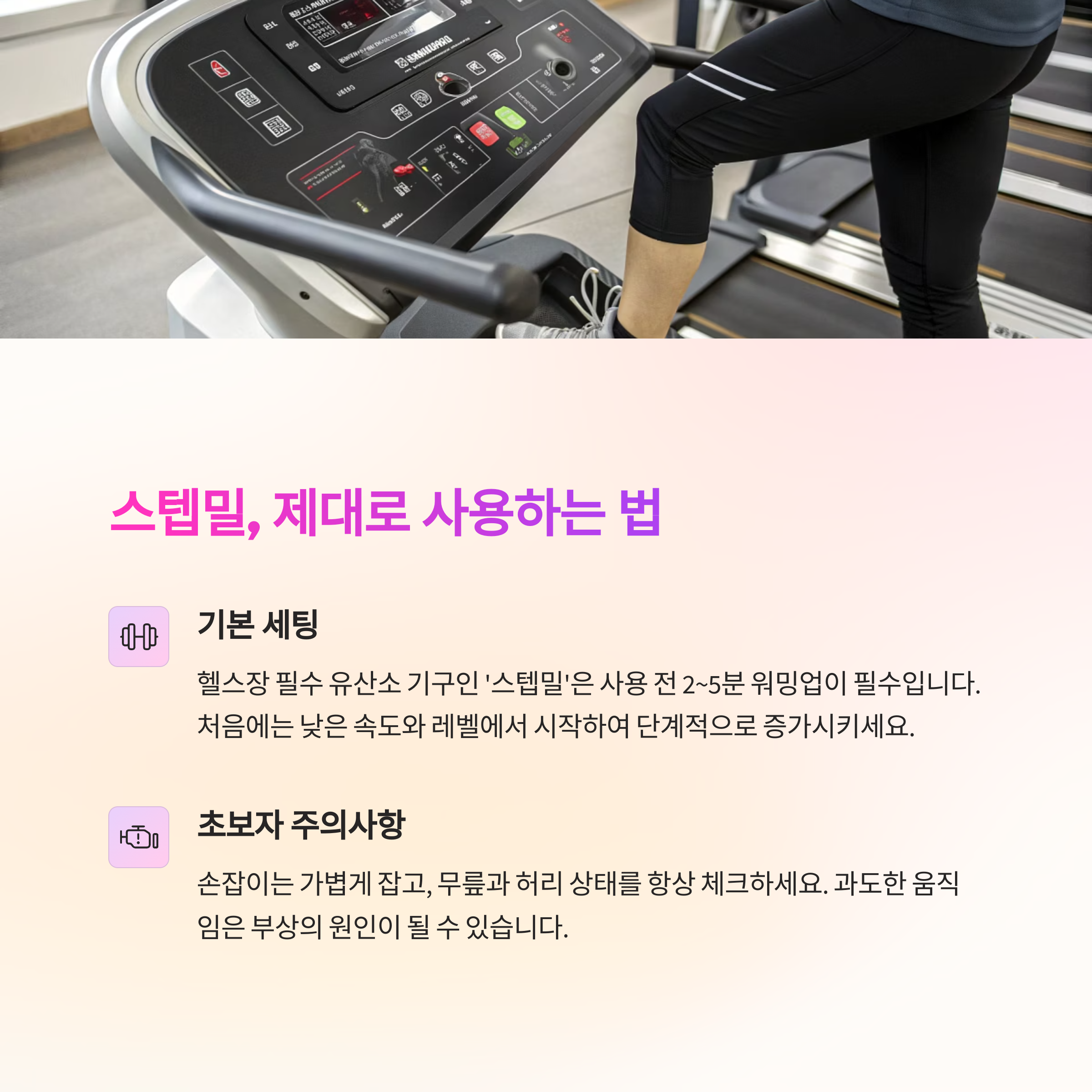 초보자는 발 전체로 디디고, 손잡이는 살짝만 잡고, 자연스러운 자세 유지가 핵심입니다.