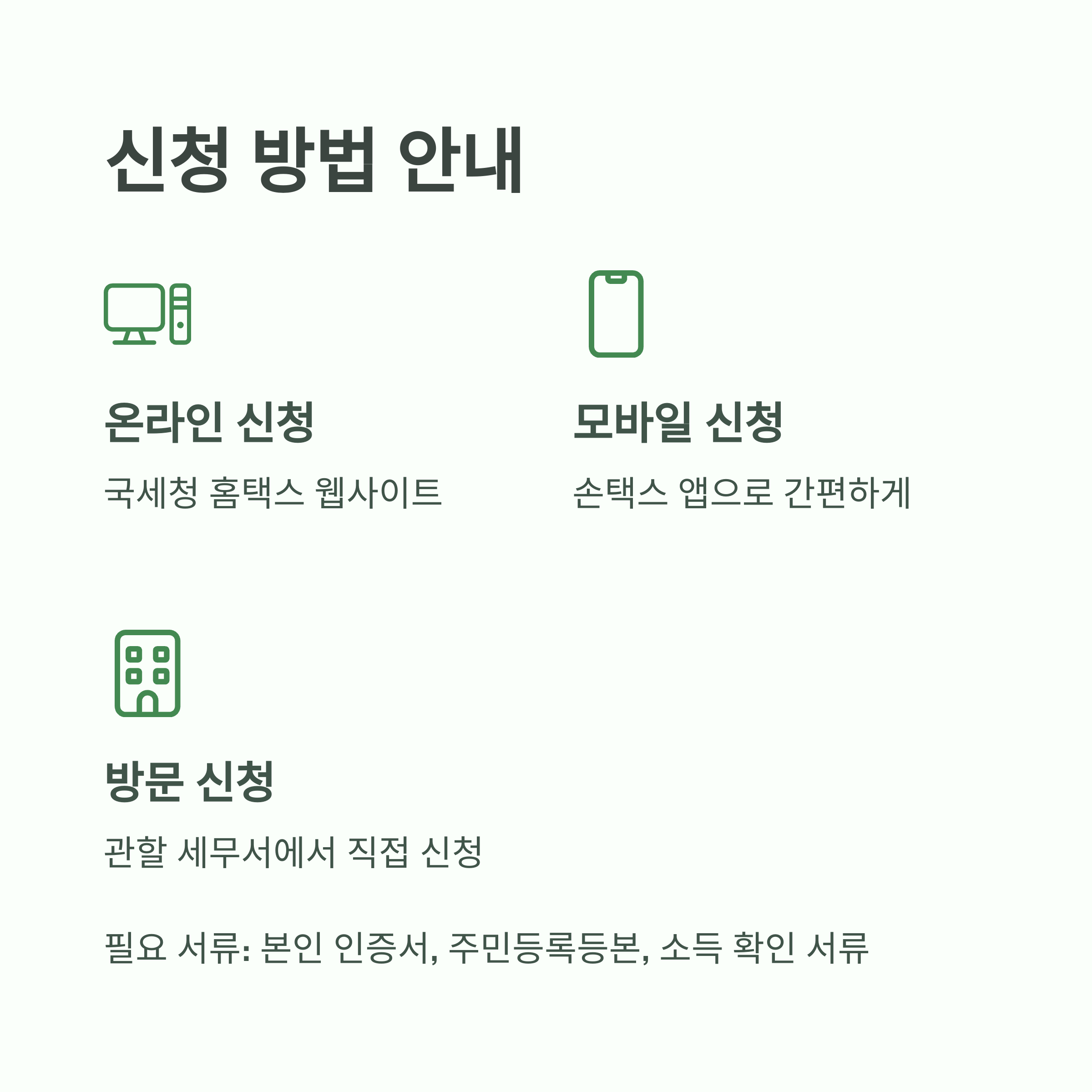 A. 국세청 홈택스, 손택스 앱, 또는 관할 세무서에서 신청할 수 있습니다.