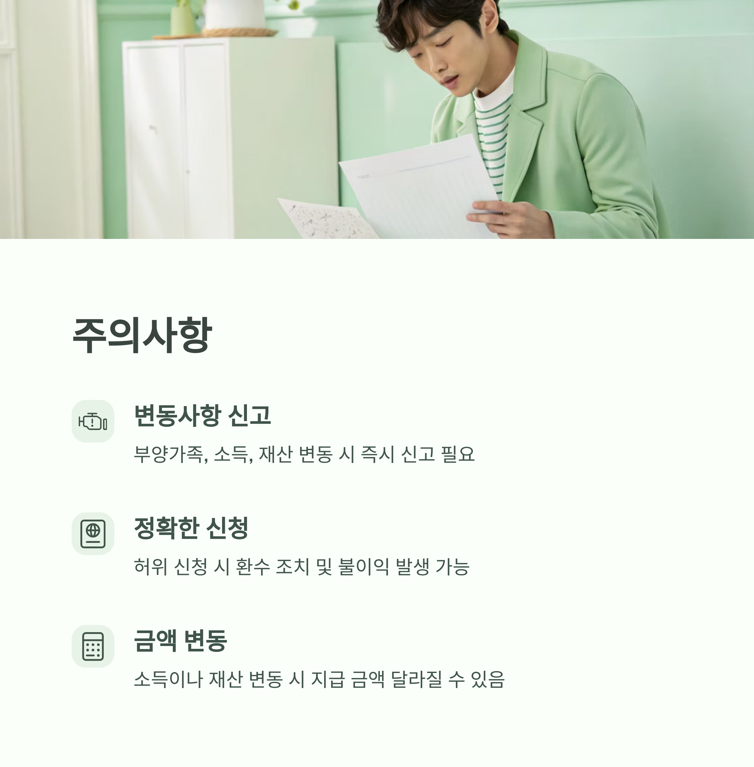 - 소득 변동이나 재산 변동이 있을 경우 지급 금액이 달라질 수 있습니다.